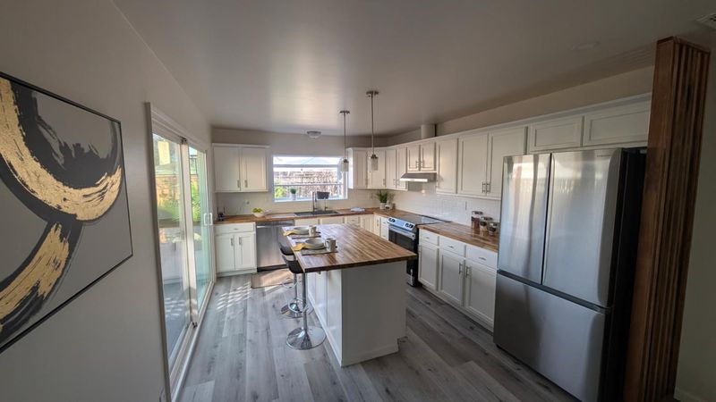 This cozy 4 bedrooms 2 bathrooms house is well staged and had been remodeled with taste. New luxury vinyl plank floors all through. Kitchen is with butcher block counter tops overlooking spacious beautiful backyard. An island in kitchen could be for breakfast nook area. Modern master bathroom with walking closet. Newer paints in and out. New electric panel installed. Mature pomegranate trees and more fruit trees in the backyard. Quiet neighborhood. Convenient location. A must see !