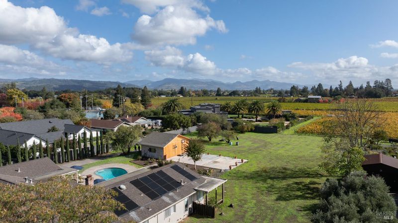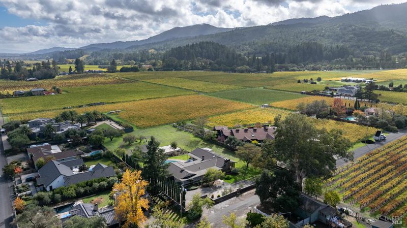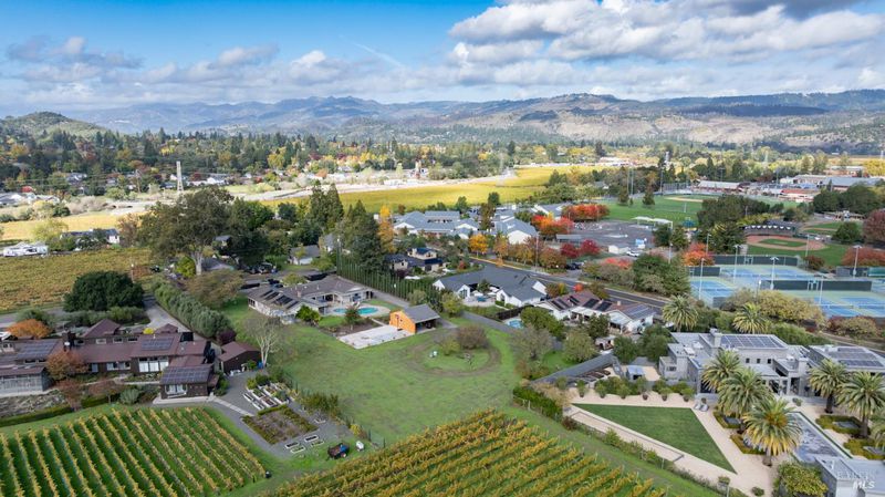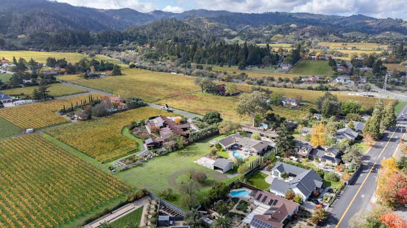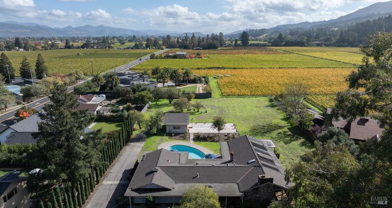 Nestled on one of Napa Valley's most sought-after lanes and surrounded by expansive vineyard parcels, this 1.27-acre south-facing property captures sweeping views toward the western hills while offering rare privacy just moments from downtown. A flat one-mile walk or ride connects you to restaurants, tasting rooms, and Sunshine Market, yet the setting remains quiet and serene. The single-level residence spans approximately 3,700 square feet and includes an attached guest house, offering flexibility for extended family or overnight guests. The classic California ranch-style home features a grand living room with a vaulted wood-beamed ceiling, two traditional wood-burning fireplaces, a heated pool, and ample outdoor storage and entertaining spaces designed for effortless indoor-outdoor living. A rare highlight is the property's future potential. Early concepts indicate the possibility of a substantial new home thoughtfully designed around the views and setting, presenting a unique opportunity to create a multi-generational compound. Located just around the corner from Crane Park, which offers tennis, bocce, pickleball, open fields, a skate park, and the weekly farmers market, the lifestyle offering is exceptional, blending vineyard-edge tranquility with immediate access to recreation and community amenities. This versatile wine country property combines privacy, views, proximity, and meaningful upside in one of the valley's most desirable locations.