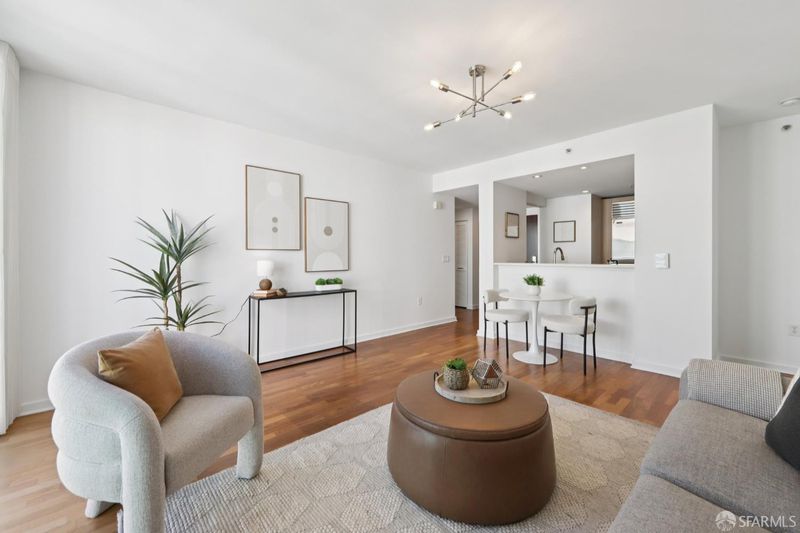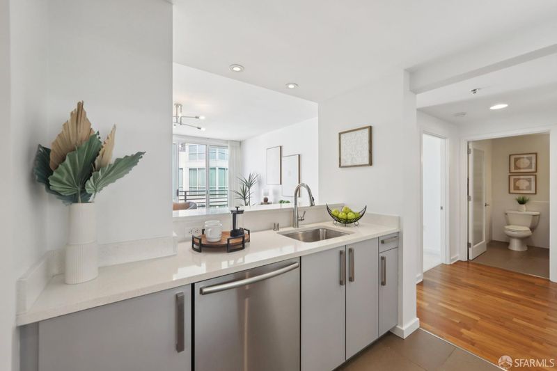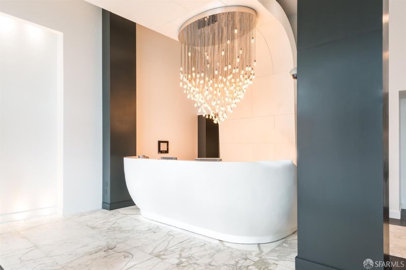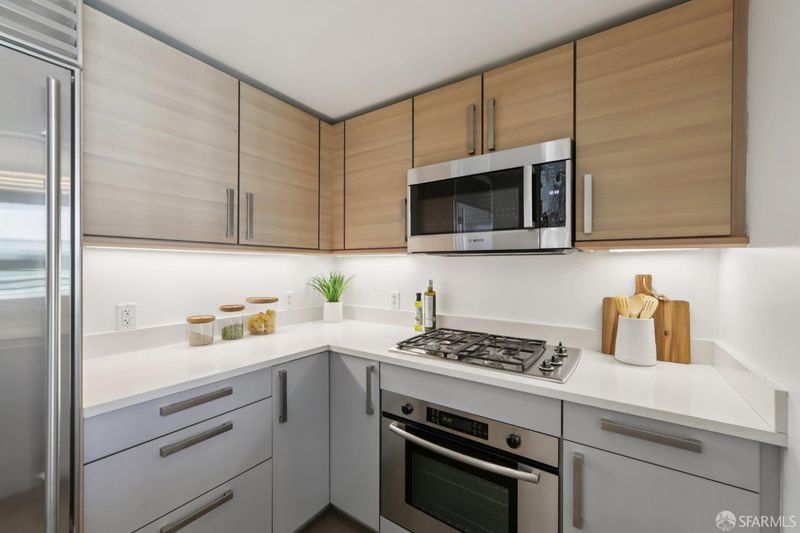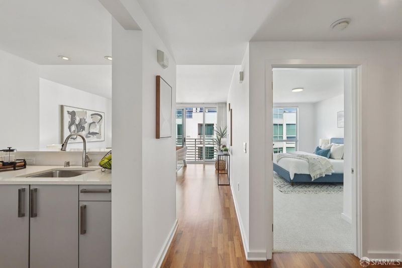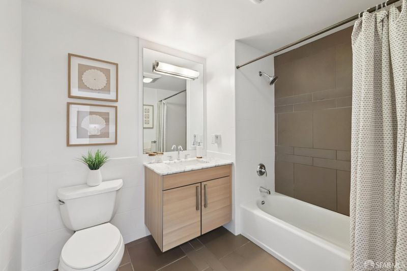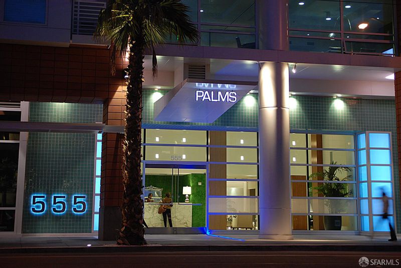 Residence 902 at The Palms offers 993 square feet of top-floor living space, featuring 2 bedrooms and 2 bathrooms, separated for privacy. Start your day with coffee on your private balcony. The semi-open kitchen is equipped with white stone countertops, two-tone cabinetry, and a Bosch-Sub-Zero appliance collection, connecting to the living space via a pass-through bar. The private primary suite features a walk-in closet with mood-setting built-ins. Both contemporary bathrooms feature floating vanities, marble counters, and striking bronze-tiled shower walls. In-unit laundry, deeded parking, and amenities complete the convenience of the home. The Palms offers residents a full suite, including 24/7 front desk, Fitness Center, Social Lounge, Business Center, Screening Theater, and Courtyard. It's also w-positioned near celebrated culinary destinations like neighborhood favorite Marlowe and Michelin-recognized establishments like Saison, Omakase, and Rooh. This South Beach address is steps from the MUNI lightrail, 0.2 miles from Caltrain, and offers easy access to Oracle Park, Chase Center, Downtown, Yerba Buena, and freeways.