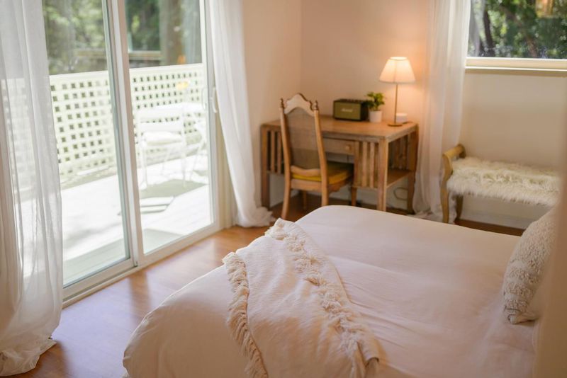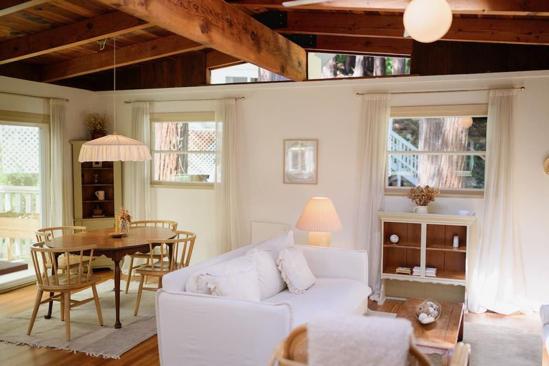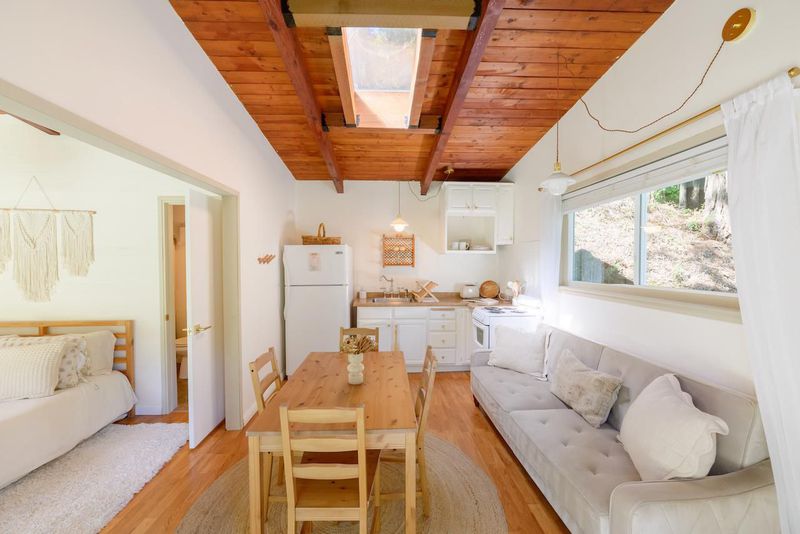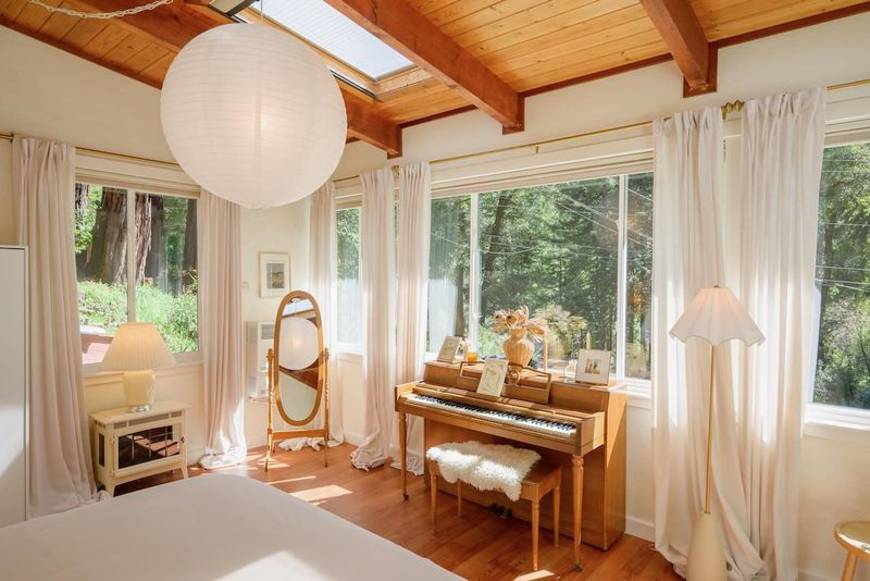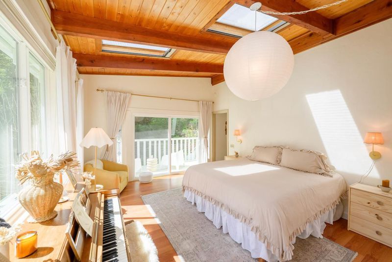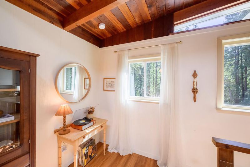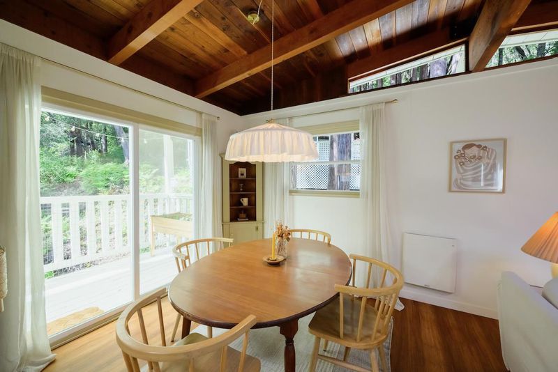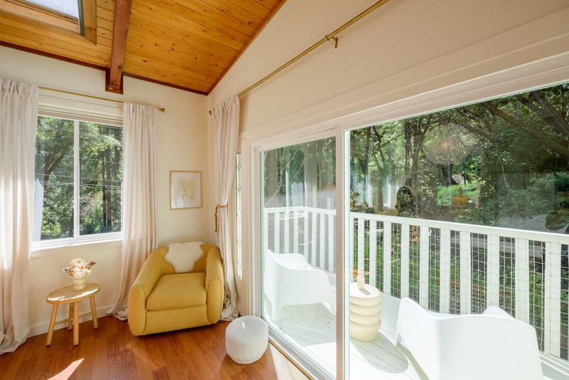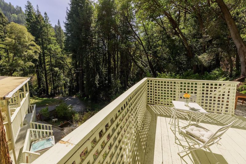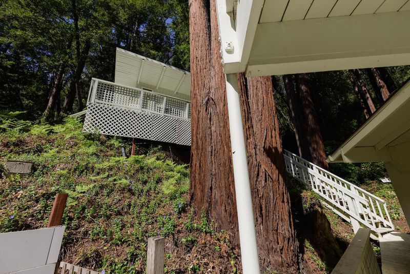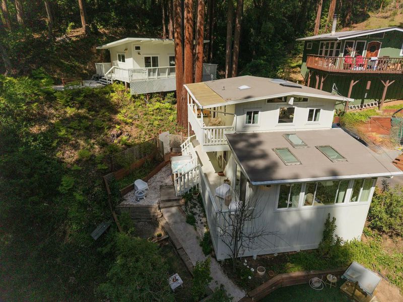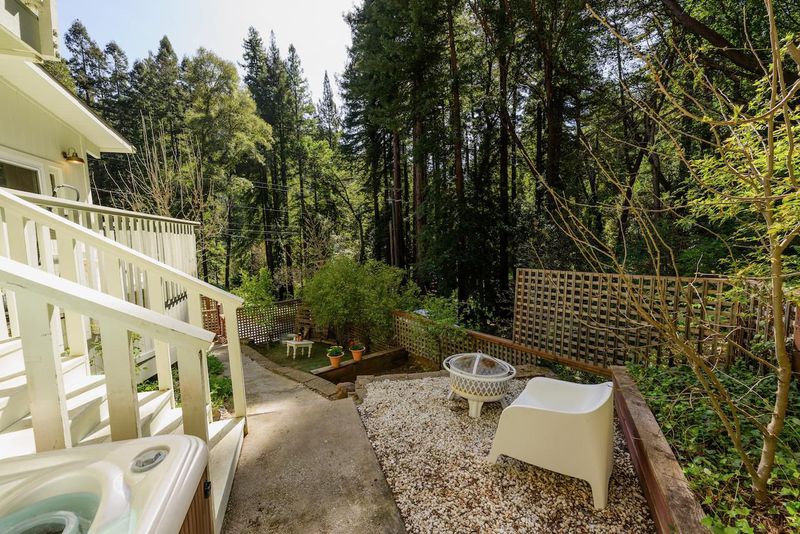 Beautifully updated home with separate ADU on a large lot featuring a peaceful forest setting and seasonal creek. The main home offers a desirable reverse floor plan with the great room and kitchen located upstairs, while three bedrooms and a full bath are on the lower level. The spacious primary bedroom is filled with natural light from multiple windows and skylights and features stunning vaulted wood-beam ceilings and private access to the front porch. The inviting kitchen offers beautiful wood-block countertops and abundant white cabinetry and flows seamlessly into the living and dining areas. Dramatic vaulted ceilings and expansive windows bring in natural light and showcase the surrounding nature. Step out onto the balcony deck for al fresco dining among the trees. A large storage and laundry room is conveniently located between the main house and ADU. The detached ADU offers a full kitchen, dining area, separate bedroom/living space, and full bathroom - perfect for guests, extended family, or a home office. Reverse osmosis water system. Multiple decks and patios, hot tub, outdoor shower, and sunny lawn areas create wonderful outdoor living spaces. Minutes to downtown Felton, hiking trails, and the beaches of Santa Cruz.