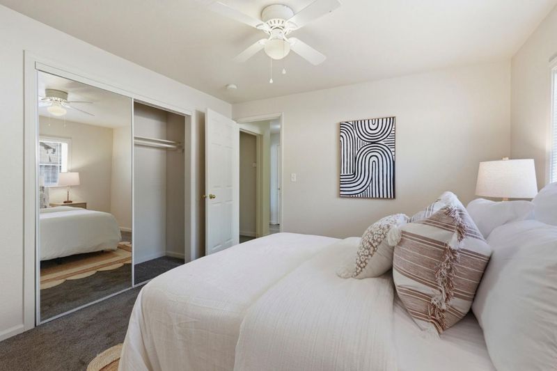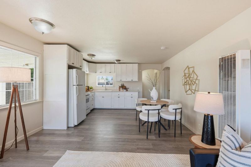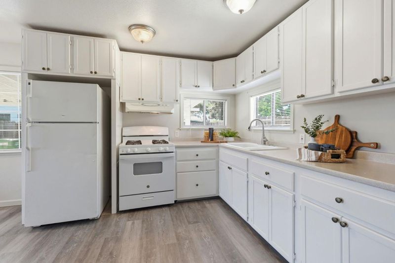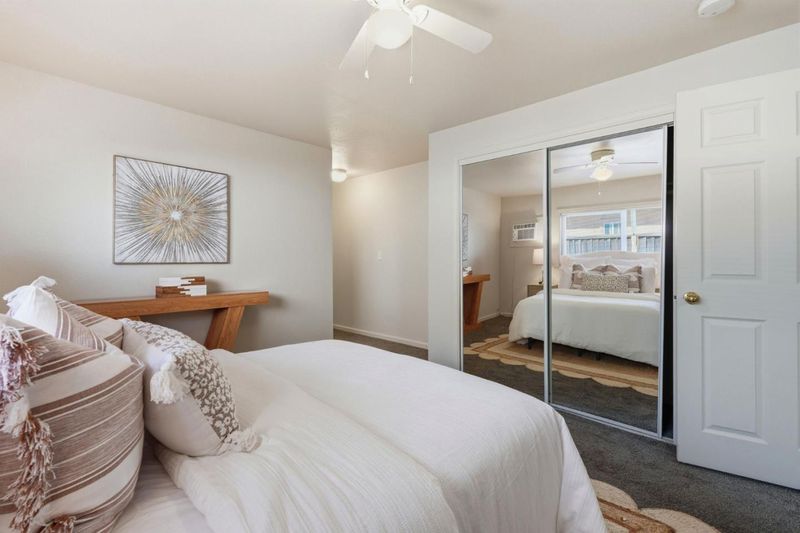 A delightful home offering the ideal blend of comfort and convenience, nestled in the charming town of Turlock. This inviting residence features a well-appointed eat-in kitchen with ample cabinetry, a gas oven range, and a refrigerator, providing everything you need for everyday cooking and entertaining. The bright living area is filled with natural light and includes A/C and a ceiling fan for year-round comfort. The primary bedroom offers its own A/C and ceiling fan, and the second bedroom is also equipped with A/C and ceiling fan, creating comfortable spaces throughout the home. You'll appreciate the two spacious bathrooms, including the updated hallway bath. Additional highlights include newer laminate flooring in the living area and fresh interior paint, giving the home a clean and welcoming feel. Exit outside to a huge backyard offering endless opportunities for gardening, entertaining, or creating your own outdoor oasis. The spacious lot also features a large workshop shed, ideal for hobbies, storage, or projects. Enjoy the convenience of being just minutes from downtown Turlock, where you'll find shopping, restaurants, and the popular local farmers market.