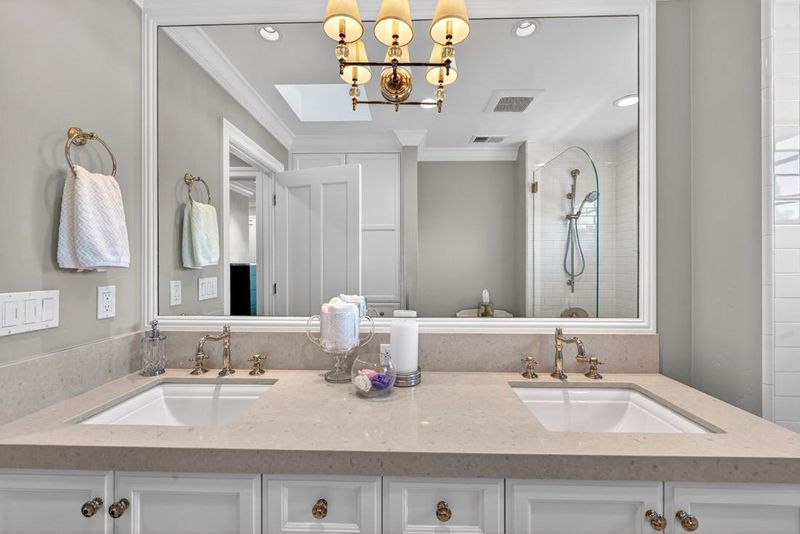 - Shower over Tub - 1, Double Sinks, Marble, Shower and Tub, Tub, Tub in Primary Bedroom, Updated Bath, Half on Ground Floor, Primary - Stall Shower(s)